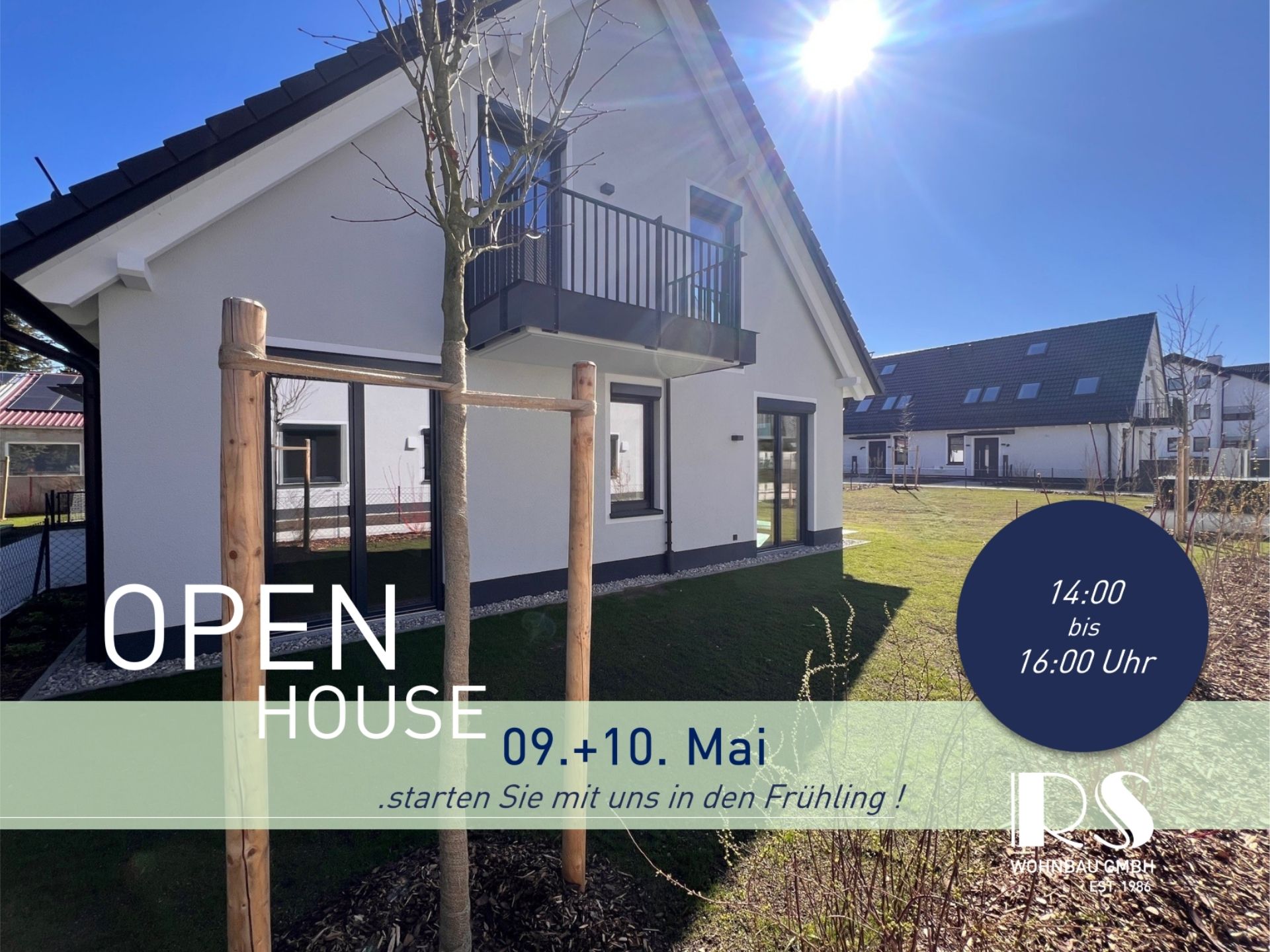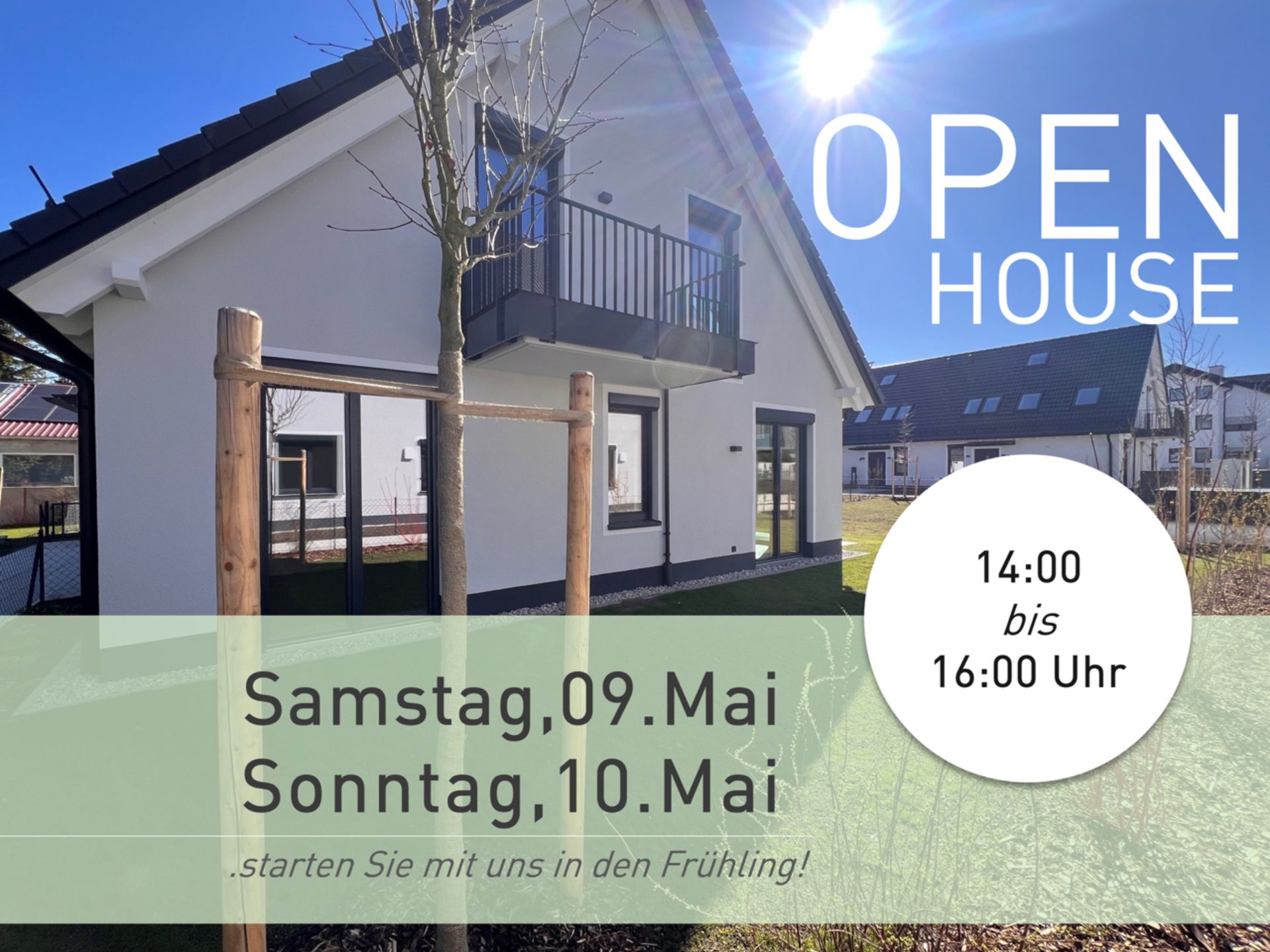 Besuchen Sie uns am Samstag, den 09. Mai 2026, sowie am Sonntag, den 10. Mai 2026, jeweils von 14:00 bis 16:00 Uhr, und verschaffen Sie sich vor Ort einen persönlichen Eindruck von den Doppelhaushälften.